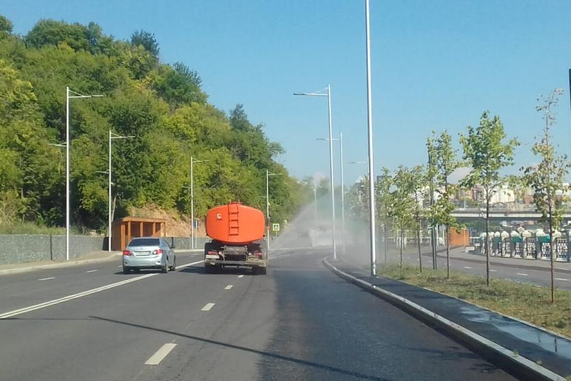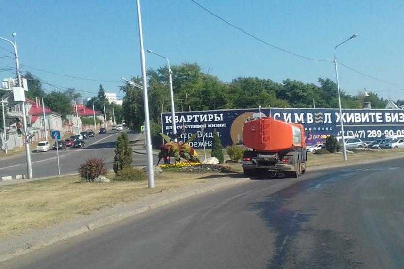 Коммунальные службы Кировского района г. Уфы в усиленном режиме поливают зеленые насаждения и дорожные покрытия, чтобы не допустить перегрева. По адресу Рабкоров 7/1 ведется ямочный ремонт дорог.